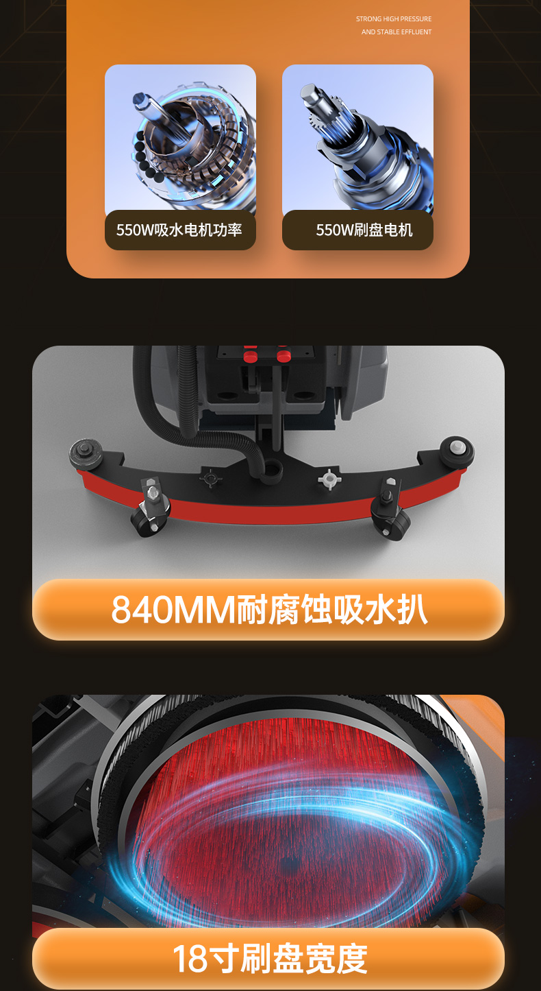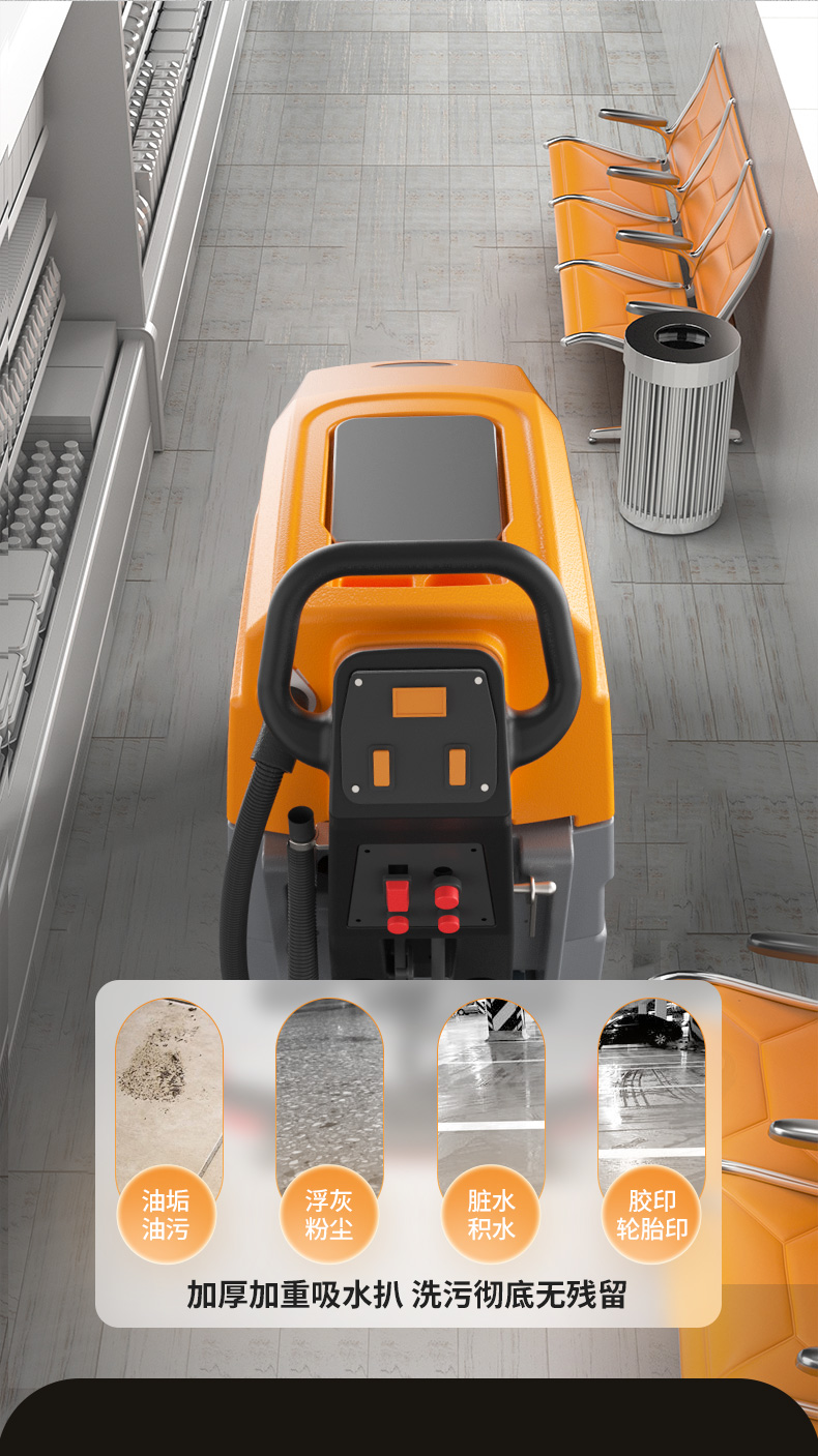 榮事達RS-M65手推式洗地機配備加厚加重吸水扒,吸污更加徹底,避免清潔過程中出現(xiàn)污水殘留。一機就能搞定地面油污、灰塵、積水問題。